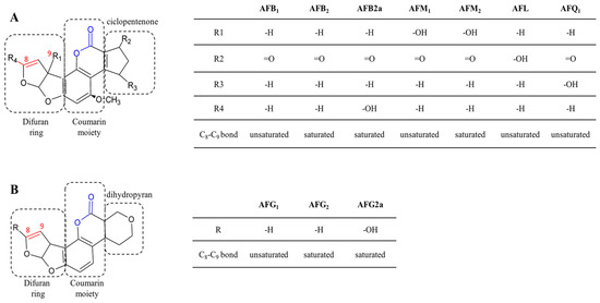 Chemical structure and features of ciclopentenone (A) and difurocoumarolactone (B) aflatoxin (AF) series. Coloured bonds indicate reactive groups involved in AFs toxicity. The double bond leading to 8,9-epoxide upon metabolic activation is indicated in red, while the lactone bond is indicated in blue. Tables show substituent groups and saturation of the C8-C9 bond in different AF analogues.