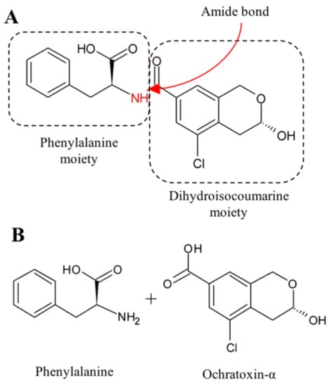 OTA is a phenylalanine-dihydroisocoumarine derivative, composed of a 7-carboxy-5-chloro-8-hydroxy-3,4-dihydro-3-R-methylisocoumarin (ochratoxin α—OTα) moiety and a l-β-phenylalanine molecule (Phe), which are linked at the 7-carboxy group by an amide bond (Figure 2).