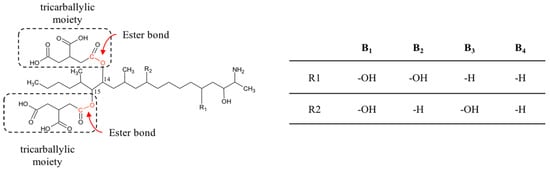 Type B fumonisins chemical structure. The ester bonds hydrolyzed by the main degrading pathways, leading to the formation of HFB1 and the two tricarballylic acid moieties, are indicated in red. The table shows substituent groups of different fumonisin analogues.