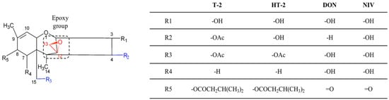 Trichothecenes are a large group of sesquiterpenoid metabolites sharing a common core structure comprised in a rigid tetracyclic ring (Figure 4). To date, more than 190 trichothecenes and derivatives have been described [96,97].