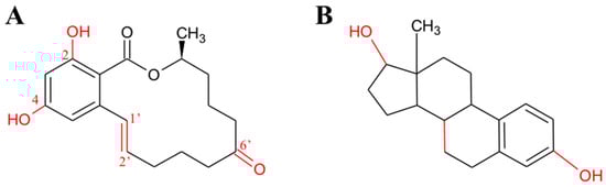 Chemical and structural analogies between zearalenone (A) and 17β-estradiol (B). The main chemical groups interacting with the estrogen receptors and responsible for zearalenone toxicity are highlighted in red (see the text for further details).
