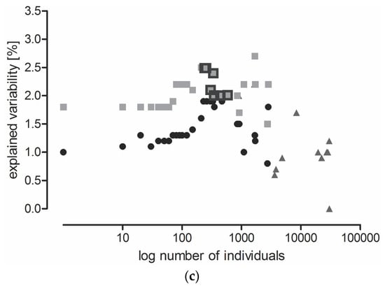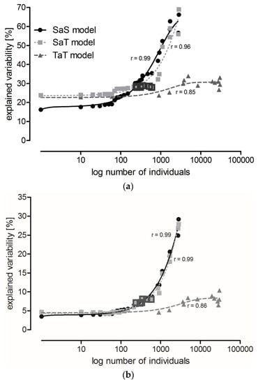 Variability explained by localities remained relatively stable in the SaS and SaT models (see Section 5.3) until species with abundance lower than 150 and 600 individuals, respectively, were disregarded (Figure 1a). Subsequent step-wise elimination of the more abundant species resulted in a steep increase in explained variability (the difference between variability explained by two adjacent points in the graphs significantly increased, SaS: F1,25 = 11.69, p = 0.002, SaT: F1,25 = 35.84, p < 10−5). Only a small increase in explained variability was observed with the TaT model (Figure 1a). The curve derived from the SaS model intersects the curves of the TaT and SaT models at the points corresponding to species represented by 117 and 229 individuals, respectively, where the variability explained by the SaS model exceeded the variability explained by both the SaT and TaT models.