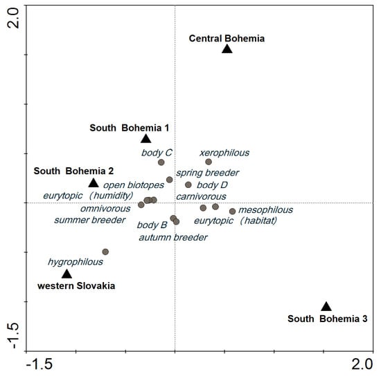 Our study evaluated carabids with respect to body size, habitat and humidity affinities, breeding period, and food specialization. This approach requires identification and counting of captured species, and then choice of indicator species that represent crucial functional traits and are sufficiently widespread for statistical analyses []. Profound changes in the representation of functional traits alter the role of carabids in the ecosystem and may have considerable environmental consequences. Simple counts of captured beetles do not disclose these environmental impacts because species with different or unknown traits are mixed up [].