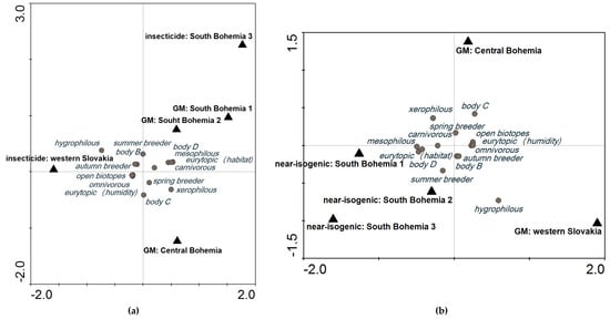 We defined baseline as a background variability that is caused by other factors (covariables in multivariate analysis) than the variables (GM vs. non-GM) whose effect is important for the purpose of the study. We hypothesize that when we know baseline, it is possible to distinguish between the background variability and variability caused by growing GM maize. The example of separation of effect of baseline from effect of GM maize is presented in Figure 3a,b. The carabid grouping in GM maize is compared there with carabid groupings in plots treated with insecticides (as they are applied in most of maize cropping systems) and plots with near-isogenic cultivar, respectively.