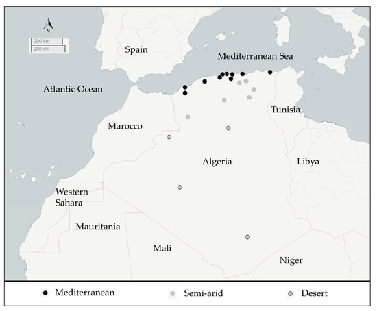 Map of Algeria showing the geographic distribution (localities) where the samples were collected (circles). The different type of circles used for the localities reflect the climatic nature of the region from which the samples were collected.
