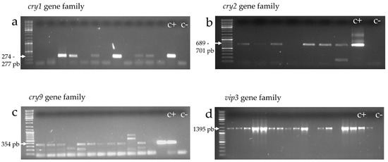 Agarose (1%) gel electrophoresis of PCR products amplified with the set of primers Un1(f)/Un1(r) (a), Un2(f)/Un2(r) (b), Un9(f)/Un9(r) (c), and vip3-sc(f)/vip3scII(r) (d), which reveal the presence of genes from the cry1, cry2, cry9, and vip3 families, respectively. Bacillus thuringiensis isolates were considered positive for the studied gene when their genomic DNA amplified with the corresponding primers and gave a band of the expected size.