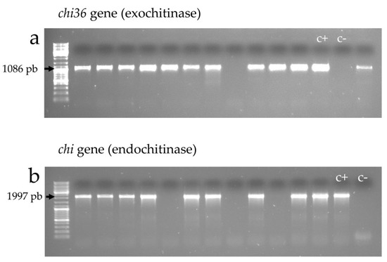Agarose (1%) gel electrophoresis of PCR products amplified with the set of primers chi36(f)/chi36(r) (a) and chit(f)/chit(r) (b), which reveal the presence of exochitinase 36 and endochitinase genes, respectively. Bacillus thuringiensis isolates were considered positive for the studied gene when the genomic DNA amplified with the corresponding primers and gave a band of the expected size.
