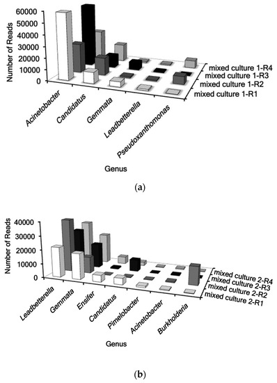 16S rRNA sequencing data for within sample repetitions of (a) Mixed Culture 1 and (b) Mixed Culture 2. Each plot graph illustrates the major genera represented in each sample in accordance with number of reads resolved from sequencing. In (a) Mixed Culture 1-R1 was the only culture that was able to modify DON from the culture media. In (b) Mixed Culture 2-R1, Mixed Culture 2-R3, and Mixed Culture 2-R4 were able to modify DON from the culture media.
