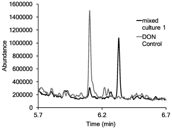 GC/MS chromatograph of DON derivatives in scan operating mode from Sample ID 2 in Table 2 (Mixed Culture 1, Wheat Sample #13w-7, 7.1 μg/mL DON). DON (grey line; retention time of 6.12 min) was modified to 3-epi-DON (black line; retention time of 6.33 min).