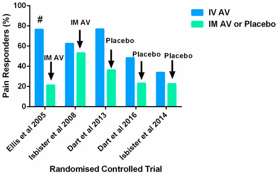 Graph of Pain Responders (Treatment Success) to IV Antivenom compared to Pain Responders (Treatment Success) to IM Antivenom or Placebo. # response at 24 h not at specified primary outcome.