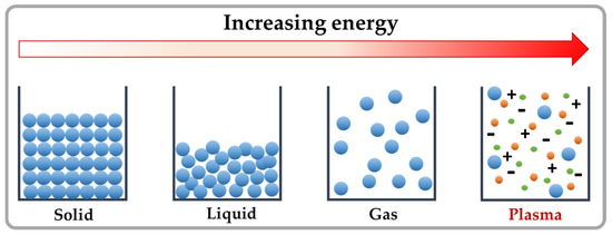 Considering the above-mentioned requirements, cold plasma technology represents a promising non-thermal mycotoxin-decontamination approach. Plasma is generally known as the fourth state of matter; a plasma state is reached by increasing the energy level of a substance from a solid state through the liquid and gaseous states of matter, ending in an ionized state of gas, which has unique physical and chemical properties (Figure 1) [15]. In electrically created plasmas, energy is delivered in the form of an electric field from an electrical power source; seed electrons produced by UV or background radiation are accelerated by the applied electric field leading to the excitation, dissociation or ionization of the background gas. Ionization, caused by the collision of an energetic electron with a neutral atom or molecule, results in the production of further electrons which are also accelerated in electric field. These free and energetic electrons subsequently collide with other surrounding molecules and atoms present in the gas, resulting in an avalanche process. Through the simultaneous generation and interaction among electrons, neutrals, metastables and ions, a vast number of reactions occur, yielding a wide variety of reactive chemical species [16,17]. In complex gas mixtures, such as humid air, a large number of reactive chemical species are created which take part in many hundreds of reactions [18]. In addition, molecules or atoms in an exited state can emit photons with wavelengths in the UVC, UVB and UVA range [19].