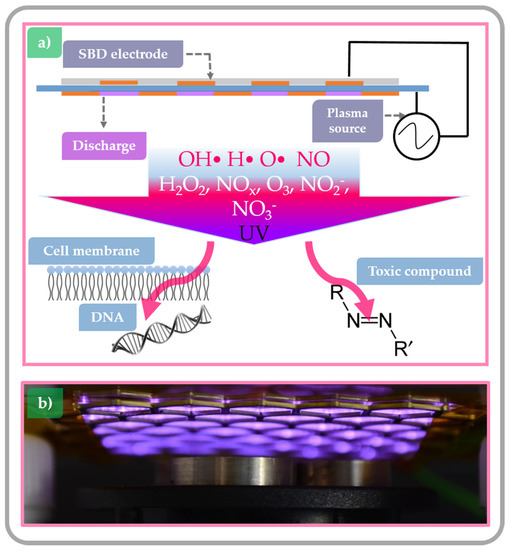 A key benefit of the use of CAP technology in the field of agriculture and food is its high decontamination efficiency, which can be achieved in short treatment times and in non-thermal conditions. Its applicability has been widely demonstrated by successful decontamination of food with bacterial pathogens (Escherichia coli, Salmonella typhimurium, Staphylococcus aureus, Listeria monocytogenes, etc.) and harmful compounds (phenolic compounds, pesticides, azo dyes, etc.) [21,35,36,37,38,39,40,41,42,43]. The mechanisms of CAP decontamination are attributed primarily to the highly reactive oxygen and nitrogen species (ROS and RNS) created within the plasma as well as UV radiation, which induce highly oxidizing effects [22,24,44,45,46].