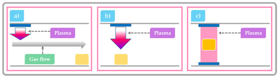 Plasma species production strongly depends on the CAP system design and its mode of operation. When building a plasma system for food processing, there is a wide range of operating or so-called discharge parameters to choose from, including different gasses (air, O2, N2, He, Ar, etc.) and gas flows, discharge types, discharge volumes, electrode setups, etc. The discharge can be generated using high-voltage electrical power sources or intense laser light [46]. In general, these systems can be divided into three groups defined by the position of the treated food product with respect to the point of plasma generation: at some significant distance from the generation point, relatively close to generation point or within the plasma discharge itself. With a change in position of the sample with respect to the plasma, the nature and flux of chemical species varies significantly and result in different surface effects [53]. The first category refers to remote treatment with CAP where the sample is physically separated from the plasma generation point. In this scenario, the plasma generated species are usually transported to the sample by diffusion or by an induced flow. By the time plasma species reach the targeted surface, they are mostly composed of longer-lived plasma species, with a negligible concentration of highly reactive species (Figure 3a) [54]. The second category of system enables a semi-direct treatment with CAP. Then the target is exposed to higher concentrations of short-lived and highly reactive chemical species due to the relatively short distance between plasma generation point and substrate. In this scenario, the flux of UV photons reaching the targeted surface is also relatively high (Figure 3b) [55]. The last category is known as a direct contact system where the sample is placed between the electrodes of the plasma generation system and is consequently bombarded by large fluxes of reactive species and UV light (Figure 3c) [56,57]. While direct treatment should offer the highest possible degradation and decontamination efficacy, its implementation is problematic. The sample forms part of the electrical circuit and its presence can disrupt the discharge leading to the formation of hot spots that can damage the product.