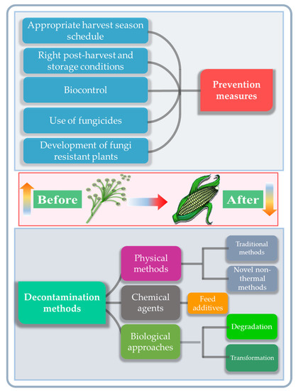 Overview of the currently available mycotoxin prevention and decontamination measures taken before and after fungal and mycotoxin contamination of food.