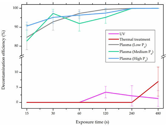 Comparison of decontamination efficiency (%) of aflatoxin B1 (AFB1) between cold atmospheric pressure plasma (CAP) and conventional decontamination approaches, UV light irradiation and thermal treatment; and air surface barrier discharge (SBD) plasma operated with three different discharge powers (Pd; low Pd, 10 W; med Pd, 15 W; and high Pd, 20 W). Ambient gas was used as a feed gas.