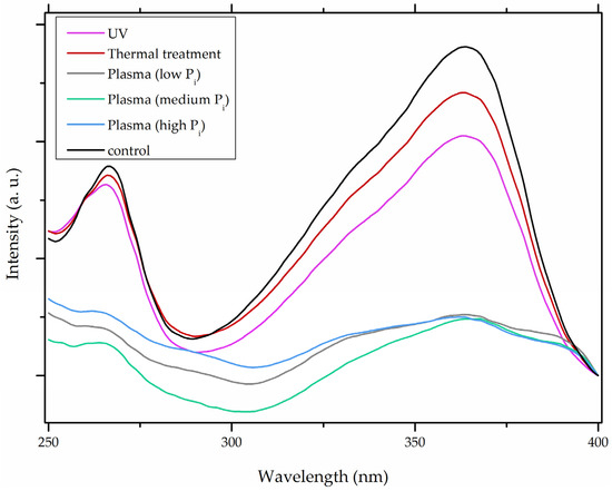 In comparison with the methods described previously, CAP mycotoxin decontamination of food overcomes many of the disadvantages and obstacles of physical, chemical and microbial decontamination procedures. As depicted in Table 3, most of the CAP systems used for decontamination of food are environmentally benign, require a low energy input and are economically favourable. Beside this, plasma approaches have proven to have a negligible effect on the quality of many types of treated food. These advantages are based on the reactivity of the plasma species which enable the high decontamination efficiency in a very short time compared to alternative decontamination methods [46,53,105]. To demonstrate the efficiency of the plasma approach, a microwave-induced atmospheric pressure plasma system was used with argon as a carrier gas to treat three different mycotoxins, AFB1, DON, and NIV dried on glass coverslips. The treatment resulted in the complete decontamination of all three mycotoxins after only 5 s of plasma exposure. Plasma treatment completely eliminated their cytotoxicity as tested on mouse macrophage RAW264.7 cells in vitro [25]. Furthermore, low-temperature radiofrequency plasma was used to degrade AFB1. After 10 min of treatment, 88.3% AFB1 was degraded. Analysis of the degradation products indicated that the toxicity should be reduced based on the structure-activity criteria; the degradation pathways indicated the formation of five different decay products (Table 2), where plasma induced the loss of the double bond in the terminal furan ring (C8-C9) [26]. AFs were exposed to a dielectric barrier discharge (DBD) plasma system, resulting in the complete destruction of mycotoxins when they were treated alone. Using the same plasma system, a 70% decontamination level was achieved for the treatment of AFB1 contaminated dehulled hazelnuts [27]. To demonstrate the effectiveness of CAP, our recent experiments consider the use of an air surface barrier discharge (SBD) plasma treatment compared with UV light irradiation or thermal treatment in regards to AFB1-destruction efficiency. Standard solution of AFB1 was prepared in the mixture of acetonitrile and deionized water (2:1). One hundred microlitres of AFB1 standard solution was applied on the glass coverslips and dried for 5 min. Such wet samples were then exposed to CAP, UVC light, or thermal treatment. CAP set-up was similar to the one reported by Ni et al. [40] and was operated at three different discharge powers (Pd): low (10 W), medium (15 W) and high (20 W). Low Pd operated plasma mostly contained ROS whereas RNS were the prevalent species at high Pd conditions. Plasma was observed to achieve more than 80% destruction level after just 15 s of treatment of AFB1 applied on, regardless of the Pd used. In contrast, no significant transformation of AFB1 was observed under thermal or UV light treatments, even at the longest exposure times (Figure 5). The ability of plasma to rapidly affect the AFB1 molecular structure was confirmed by UV-Vis spectrometry. As evident from Figure 6, both major peaks in the UV-Vis spectra of AFB1 significantly changed after 8 min of exposure of AFB1 to plasma, independently of the Pd. On the other hand, the AFB1 UV-Vis spectra remained almost the same following the UV or thermal treatment for the same time period. UV light irradiation treatment is usually efficient in degrading only the mycotoxin molecules, in particular AFs, which are known for their photosensitivity [74,75,76]. Beside this, UV irradiation represents one of the most commonly used decontamination approaches in food processing [106]. Comparing to CAP, to achieve adequate results, this method requires much longer exposure times (more than 10 min compared to some seconds in the case of CAP). Here, it is worth mentioning that UV requires higher power inputs which further impacts the decontamination efficiency. In addition to the mentioned drawbacks, it has been reported that UV irradiation could even increase the mutagenicity of AFs [107]. The characteristics of mycotoxin plasma treatment can be compared to some extent with ozone treatment, since one of the prevalent plasma-produced long-lived molecular species is ozone [108]. As many other reactive species beside ozone are produced in the plasma, synergistic effects can occur, resulting in the mycotoxin decontamination of food requiring significantly less exposure times than ozone alone [48,84,85]. Despite numerous advantages, CAP technology also has some limitations. One of the major problems is an inability to precisely control the gas phase chemistry when using ambient air, given that it varies with conditions in the surrounding atmosphere (for example increases in humidity). Since CAP contains ROS, it is not suitable for the treatment of high-fat food products. Furthermore, when carried out using very high voltages, additional safety measures are required as well as systems for the destruction and exhaust of potentially harmful long-lived species such as O3 and NO2 [46].