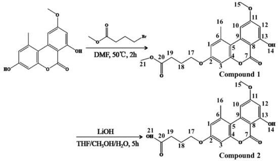 The schematic of AME carboxyl derivative modification is shown in Figure 1. AME linked methyl ester (compound 1) and the AME linked carboxylic acid (compound 2) were revealed by NMR. The following 1H-NMR (400 MHz, DMSO) of AME linked methyl ester (compound 1) was produced: δ 11.81 (s, 1 H, 14), 7.28 (s, 1 H, 10), 6.91 (s, 2 H, 1 and 3), 6.67 (s, 1 H, 12), 4.10 (t, J = 6.1 Hz, 2 H, 17), 3.93 (s, 3 H, 15), 3.63 (s, 3 H, 21), 2.79 (s, 3 H, 16), 2.49–2.42 (m, 2 H, 19), 2.07–1.93 (m, 2 H, 18). The following 1H-NMR (400 MHz, DMSO) of AME linked carboxylic acid (compound 2) was produced: δ 12.17 (s, 1 H, 21), 11.79 (s, 1 H, 14), 7.19 (s, 1 H, 10), 6.85 (d, J = 7.0 Hz, 2 H, 1 and 3), 6.61 (d, J = 1.7 Hz, 1 H, 12), 4.07 (t, J = 6.4 Hz, 2 H, 17), 3.90 (s, 3 H, 15), 2.73 (s, 3 H, 16), 2.41 (t, J = 7.3 Hz, 2 H, 19), 1.97 (p, J = 6.7 Hz, 2 H, 18). The results of NMR indicated that AME was modified with methyl ester and carboxylic acid successfully, respectively. In addition, the yield and purity were 76% and ˃95% for compound 1, respectively, and were 28% and >98% for compound 2, respectively.