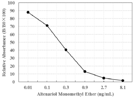 Typical standard curves of the competitive ELISA for alternariol monomethyl ether (AME). Three replicate wells of all the standard concentrations (0.01, 0.1, 0.3, 0.9, 2.7, 8.1 ng/mL) were analyzed.