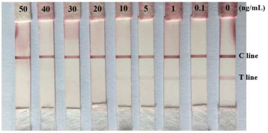 Several standard solutions of AME at the concentrations of 50, 40, 30, 20, 10, 5, 1, 0.1, and 0 ng/mL were prepared by diluting AME (1 mg/mL in dimethylformamide (DMF)) with PBS. These AME standard solutions (70 μL) were measured by the immunochromatographic strips. The results were judged by visualization within 10 min. As shown in Figure 5, the intensity of red density on T lines reduced when the concentration of AME toxins increased. The color intensity of the colloidal gold immunochromatographic strip tests is inversely proportional to AME concentrations in the range 0.1–10 ng/mL. The visual LOD of AME immunochromatographic strip is defined as the concentration of AME standard solution that causes the T line to be completely invisible. Therefore, the LOD of the strip test for AME was about 10 ng/mL. When the AME concentration was above the LOD, there was not a red line on the T line, and there was only one red line on the C line. On the contrary, if there are two red lines on the nitrocellulose (NC) membrane, it shows that the concentration of AME in sample is below the LOD.