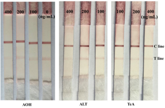 AOH, ALT, and tenuazonic acid (TeA) have similar structures to AME. They were chosen to study the cross reactivity of the prepared immunochromatographic strips. The concentrations of 400, 200, and 100 ng/mL of AOH, ALT, and TeA were used in the prepared immunochromatographic strips, respectively. As shown in Figure 6, when the concentrations of AOH, ALT, and TeA were at 100, 200, and 400 ng/mL, the intensity of the red color at T lines was slightly weaker compared to that of 0 ng/mL, but the loss of the intensity of red density was not significant. Hence, no significant cross-reactivity was observed with AOH, ALT, and TeA. All of the results indicated that the presence of these mycotoxins (AOH, ALT, and TeA) in the test sample did not interfere with the detection of AME. As such, the prepared immunochromatographic strips have good specificity.