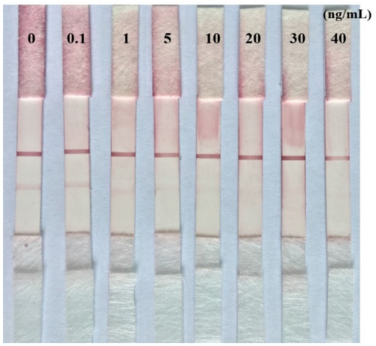 A batch of assembly completed immunochromatographic strips were prepared at the same time. Some of them (stored 0 days) were used for studying the detection limit (Figure 5). Other immunochromatographic strips were kept at room temperature for 3 months in a zip-lock plastic bag containing silica gel desiccant and were used for evaluating the stability performance. These strips were used for the detecting a series of different concentrations AME of 0, 0.1, 1, 5, 10, 20, 30, 40 ng/mL. The results of Figure 7 showed that the density of the color on T line and C line seem slightly weaker compared to those immunochromatographic strips which were stored 0 days, but the loss of the intensity of red density was not significant. The results showed that the colloidal gold immunochromatographic strip developed in this study has good stability, and it may be suitable as a commercial kit for rapid detection.