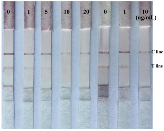 Limit of detection (LOD) of AME with colloidal gold immunochromatographic strip. A series of dilutions (0–50 ng/mL) of AME standard solutions were prepared by diluting AME in PBS. When the concentration of AME was higher than 10 ng/mL, the red line at the T line disappeared.