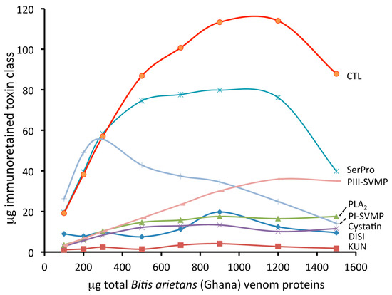Using this approach, it was calculated that 1 gram (6.6 micromoles) of EchiTAb-Plus-ICP® IgGs had maximal binding capacity of 51 mg (2 micromoles) B. arietans venom proteins. This value agrees well with the quantification obtained by antivenomics in Section 2.1. Assuming that each IgG molecule bound two molecules of target venom protein, we estimated that 15% of EchiTAb-Plus-ICP® antibody molecules target B. arietans (Ghana) venom toxins. Taking into account that EchiTAb-Plus-ICP® is a polyspecific antivenom and that B. arietans venom is only one of the three venoms used in its generation [26], this figure is in agreement with the value, frequently quoted in the toxinology community, of 10–40% of non-immunopurified animal antivenom antibodies being directed against venom components [36,41,42].