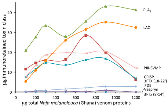 Graphical representation of the binding capacity of the different toxin classes of N. melanoleuca (Ghana) venom in 300 µL of immobilized (8 mg) EchiTAb-Plus-ICP® antivenom immunoaffinity columns as a function of the amounts of incubated venom proteins (100–1200 μg). The maximal binding capacity of EchiTAb-Plus-ICP® for forest cobra venom toxins was calculated as described in the legend of Figure 2.