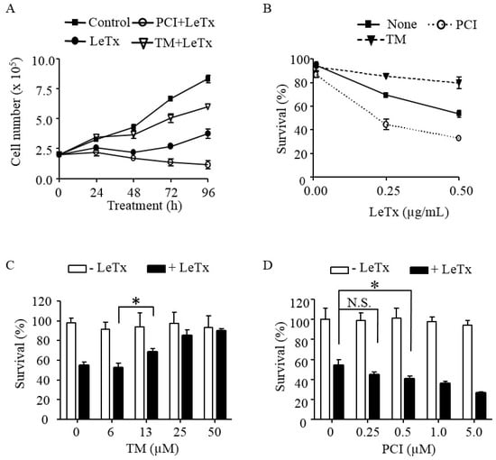 To examine the role of HDAC8 in cytotoxic effects of LeTx, THP-1 cells were treated with LeTx in the presence or absence of the HDAC8-specific activator TM-2-51 (TM) [25] or inhibitor PCI-34051 (PCI) [26], and total live cell numbers were counted each day for four days (Figure 1A). Cell numbers of LeTx-treated cells remained constant for 2–3 days and then started increasing on Day 3 (Figure 1A). Numbers of cells treated with both LeTx and PCI were steadily decreased throughout the experimental period (four days). However, cells treated with both LeTx and TM were continuously increased, albeit with a slower rate than that of non-treated cells. The cytotoxic and cytoprotective effects of PCI and TM, respectively, were similarly observed in two different doses of LeTx (Figure 1B). Significant cytoprotective effects of TM were detected, starting at 13 µM and maximum at 25 µM (Figure 1C). In contrast, PCI gradually increased cytotoxicity of LeTx, becoming statistically significant at 0.5 µM and maximally at 5 µM (Figure 1D).