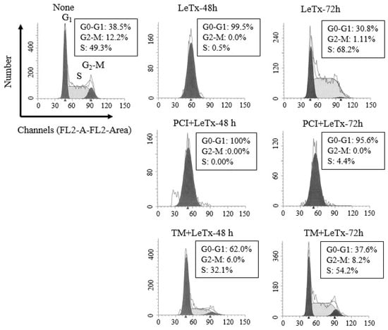 LeTx causes a transient cell cycle arrest in THP-1 cells [15]. Similarly, we detected a complete cell cycle arrest at Go-G1 stage 48 h post LeTx treatment, which was then spontaneously recovered 72 h post LeTx treatment (Figure 2; top lane). However, when cells were treated together with PCI, they failed to recover from the arrest (middle lane). Cell cycle progression of cells treated together with TM was slightly altered in 48 h, but became almost normal in 72 h of LeTx treatments (lower lane). These results indicate that HDAC8 protects cells from LeTx-induced cell cycle arrest.