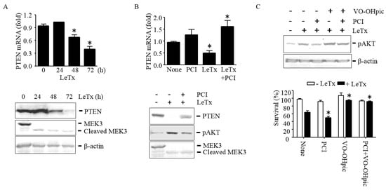 PTEN is a tumor suppressor gene that counteracts PI3K activity through dephosphorylating PI(3,4,5)P3 to produce PI(4,5)P2 [41]. PTEN activity is regulated by multiple post-translational modifications such as phosphorylation, ubiquitylation, acetylation, SUMOylation, oxidation and protein–protein interactions, but transcriptional regulation of PTEN plays a key role in determining PI3K-AKT dependent cell proliferation, survival and metabolic phenotypes [27,42,43,44]. Various cellular stresses and growth factors also regulate expression of PTEN [45,46,47,48]. Activation of MAPKs is involved in the regulation of PTEN expression; however, its role in PTEN expression varies depending on cell types [48,49,50]. We detected PTEN mRNA and protein expression levels were down-regulated by LeTx (Figure 4A) in a PCI-sensitive manner (Figure 4B). Consistently, the PTEN-specific inhibitor VO-OHpic [51] further enhanced AKT phosphorylation and cell survival in LeTx-treated cells. Collectively, these results suggest that LeTx induces AKT activation at least in part through HDAC8-dependent down-regulation of PTEN expression.