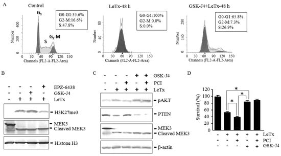 2.6. GSK-J4 Induces AKT Activation and Prevents Cell Cycle Arrest even in the Presence of PCI in LeTx-Treated Cells