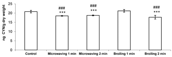 Regarding cyanotoxins, there are only documented studies on the effects of cooking on microcystins (MCs), nodularin (NOD), paralytic shellfish toxins (PSP-toxins) and CYN in clams, mussels, scallops, prawns and fish [13,14,15,16,17,18,19,20,21]. Different patterns of variation for MC levels have been shown in several studies. Guzmán-Guillén et al. [20] showed a reduction on MC-LR (59.3%), MC-YR (56.4%) and MC-RR (45.0%) in fish after boiling, while other authors found a significant increase of MCs in bighead carp and clams [19,21], and no significant changes were found in MC content in mussels after boiling [16]. Moreover, it has been shown that the microwave treatment (for 5 min) significantly reduced the MC content in different aquatic organisms (fish, mussels and clams) [16,20,21]. Bruno et al. [17] observed a partial degradation of MCs after stir-frying (36.3%) and braising (81.6%) fish and a significant increase in baked fish (28%).