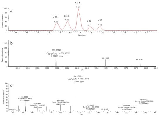 In this work, as a novelty, a total of six diastereoisomers (C-3A, C-3B, C-3C, C-3D, C-3E and C-3F) (Figure 2) of the decomposition product with m/z 336.16663 were found in samples submitted to microwaving. These results agree in part with those previously found by Adamski et al. [22] in C. racibosrkii cultures under the influence of temperature and pH, who reported four decomposition products for the same molecular ion at m/z 336.16663.
