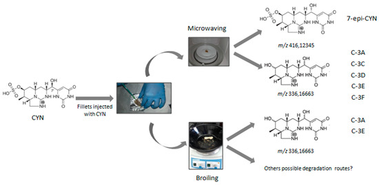 The characterization of the decomposition compounds was only possible when high concentrations of CYN (40 µg CYN/g d.w) were used. The mass spectra of samples revealed: a maximum of 11 decomposition products in samples submitted to microwaving, 7 decomposition products after broiling, with 5 of them (C-1, C-2A, C-2B, 7-epi-CYN, and C-4) being present in all CYN-injected samples (uncooked, microwaving and broiling samples) ([14], Table 1 and Table 2).