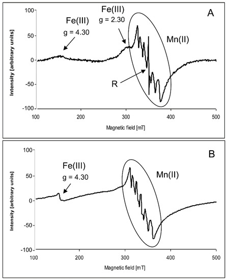 The EPR spectroscopy provided information on the changes in the amount and character of Mn(II) and Fe(III) species occurring as a result of ZEA treatment. The main signal of all spectra was composed of a broad line with overlapping well-resolved hyperfine structure, which was attributed to the manganese species. The hyperfine structure originated from the freely rotating aqua-complex of Mn(II), and was often detected in the EPR spectra of plant materials [19,31,32]. The broad line was attributed to dipole–dipole interacting manganese ions situated in the protein matrix. A thorough discussion of Mn(II) signals and their attribution to particular Mn species was made in our previous paper [31].