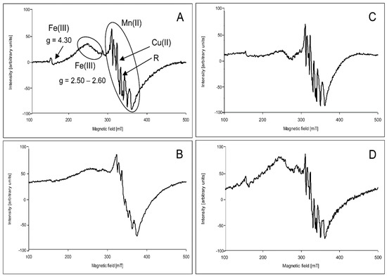 Example of the electron paramagnetic resonance (EPR) spectra of wheat hypocotyl registered at 77 K: (A) control; (B) after treatment of grains with ZEA; (C) after treatment of grains with ZEA + Se; and (D) after treatment of grains with ZEA + EBR.