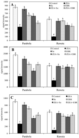Grains of both investigated wheat genotypes contained ZEA in similar and low concentrations, although this was slightly higher in the case of Raweta (Table 1). After a 24-h treatment with the ZEA solution, the accumulation of this toxin increased by about 4.8-fold and 5.0-fold for Parabola and Raweta, respectively. In the mixtures of ZEA + Se and ZEA + EBR, a decrease in ZEA uptake was about 30% and 15% for both genotypes, respectively, when compared to pure ZEA solutions. In the presence of Se and EBR separately, contamination of ZEA occurred at the same level as in the control samples.