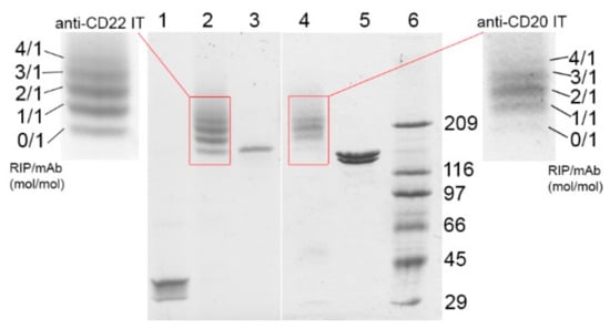 Analysis of rituximab/saporin-S6 (anti-CD20 IT) and OM124/saporin-S6 (anti-CD22 IT) immunotoxins by SDS–PAGE under non-reducing conditions. The gel was stained with Coomassie blue and subjected to densitometric analysis to establish the ribosome-inactivating protein (RIP)/mAb molar ratio. Lane 1: unconjugated saporin-S6, lane 2: anti-CD22 IT, lane 3: unconjugated OM124, lane 4: anti-CD20 IT, lane 5: unconjugated rituximab, lane 6: Mw standards expressed in kDa.