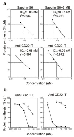 The ability of the ITs to inhibit cellular protein synthesis was assayed in CD20-/CD22-positive Raji cells after 96 h of treatment (Figure 2b) and was compared to the mixture of unconjugated mAbs and saporin-S6. The anti-CD20 IT showed excellent efficacy with IC50 values of 1.99 nM, and it was able to almost completely abolish protein synthesis at a 10 nM concentration, expressed as RIP content. The anti-CD22 IT showed a higher inhibitory activity in Raji cells than the anti-CD20 IT with an IC50 of 0.060 nM and a complete protein synthesis inhibition already at a 1 nM concentration. The mixture of free RIP and either anti-CD20 or anti-CD22 mAbs produced scarce effect on Raji cell protein synthesis, with IC50 values >100 nM (highest tested concentration).