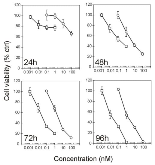 Effect of the immunotoxins on Raji cell viability. Raji cells were incubated for the indicated times with different doses of anti-CD20 IT (○) or anti-CD22 IT (□). Cell viability was measured by MTS salt reduction, as described in the methods section, and expressed as percentage of untreated cells. Means ± S.D. of three independent experiments, each in triplicate, are given. SD never exceeded 15%. At every tested time, the curves are significantly different from each other (p < 0.0001). MTS = 3-(4,5-dimethylthiazol-2-yl)-5-(3-carboxymethoxyphenyl)-2-(4-sulfophenyl)-2H-tetrazolium.