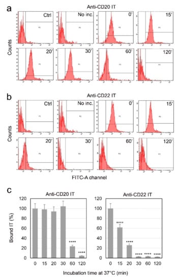 The two ITs have a similar binding intensity to Raji cells at 0’ (compare histograms in Figure 4a,b 0’). In the case of the anti-CD20 IT (Figure 4a,c), the positivity to FITC remained unchanged from 0 to 30 min at 37 °C. The IT bound to the membrane significantly decreased after 60 min and was almost completely absent after 120 min, indicating the partial and complete internalization of the CD20-IT complex, respectively.