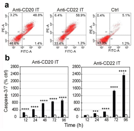 The presence of membrane apoptotic and necrotic changes in Raji cells treated for 96 h with the ITs was evaluated by double staining with Annexin V-EGFP (AnnV) and propidium iodide (PI) at concentrations of 1 nM for anti-CD20 IT and 0.01 nM for anti-CD22 IT. As shown in Figure 5a, after exposure to ITs, approximately 50% (anti-CD20 IT) and 60% (anti-CD22 IT) of cells were positive for AnnV and PI double staining, indicating a late apoptosis stage. A very low percentage of necrotic cells (AnnV−/PI+) was evidenced for both ITs, 3.2% for anti-CD20 IT and 6.4% for anti-CD22 IT (Figure 5a), compared to approximately 0.5% in untreated cells.