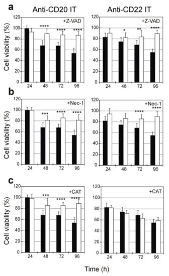 Viability of Raji cells treated for 24, 48, 72, and 96 h with 1 nM anti-CD20 IT (left) or 0.01 nM anti-CD22 IT (right) without (black columns) or in the presence (white columns) of 10 μM pan-caspase inhibitor (Z-VAD) (a), 10 μM necroptosis inhibitor necrostatin-1 (Nec-1) (b) or 10 U/mL hydrogen peroxide scavenger catalase (CAT) (c). Z-VAD, Nec-1 and CAT were added 3 h before the ITs, and the viability was measured after the indicated times. Means ± S.D. of at least three independent experiments, each in triplicate, are shown as the percentage of untreated cell values. Statistical significance was determined by ANOVA/Bonferroni test. Asterisks indicate the significant difference in each experimental condition between IT alone and IT plus inhibitors/scavenger (**** p < 0.0001; *** p < 0.001; ** p < 0.01; * p < 0.05).