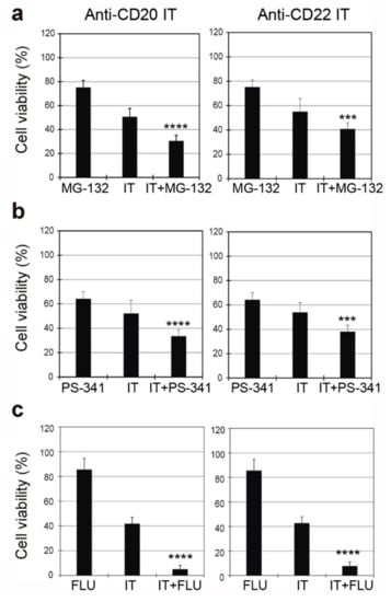 Viability of Raji cells treated for 96 h with 1 nM anti-CD20 IT (left) or 0.01 nM anti-CD22 IT (right) alone or in the presence of the proteasome inhibitors MG-132 (0.1 μM) (a) or PS-341 (1 nM) (b) or the purine analogue fludarabine (FLU) (0.75 μM) (c). Inhibitors and FLU were added 3 h before the ITs and maintained for the entire incubation time. Cell viability was determined after 96 h. Means ± S.D. of three independent experiments, each in triplicate, are showed as the percentage of the untreated cell values. Statistical significance was determined by ANOVA/Bonferroni test. Asterisks indicate the significant difference in each experimental condition between IT alone and IT plus the inhibitor or the purine analogue (**** p < 0.0001; *** p < 0.001).