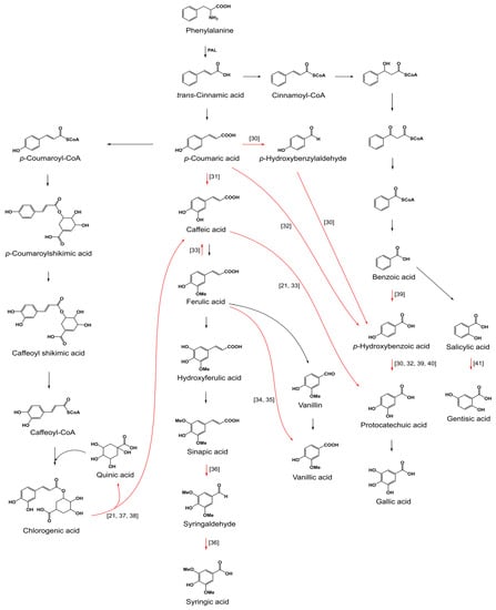 Schematic representation of some of the core biochemical pathways of major phenolic acids (based on Kaushik et al. [,,,,,,,,,,,,]) with an indication of the routes of the conversion and degradation of phenolic acids by fungi. Red arrows indicate the routes of either the conversion or degradation of phenolic acids by fungi. The numbers near the red arrows indicate the literature from which the data originates.