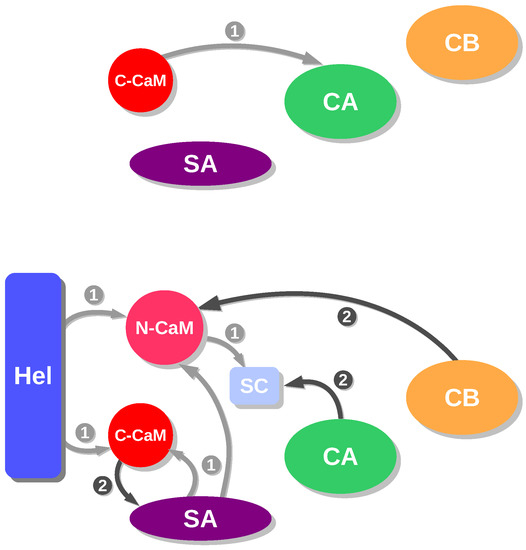 Schemes of energetic influences for AC/C-CaM (top) and EF/CaM (bottom) in the presence of Ca ions. In the complex AC/C-CaM, the different regions are defined as in the caption of Figure 1. In the complex EF/CaM, the different regions are defined in the following way: CA residues 292–345 and 490–501 and 576–622), CB (residues 346–489), SA (residues 502–575), Hel (residues 660–767), SwitchC (residues 623–659), N-CaM (N terminal lobe of calmodulin: residues 5–84), C-CaM (C terminal lobe of calmodulin: residues 85–147). This figure was reproduced from [21].