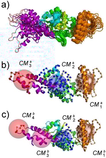 The first step for realizing an exploration of the AC conformational space using an enhanced sampling approach was the determination of collective variables. These collective variables are geometrical parameters that describe the variation of protein conformation during the conformational space exploration. Geometric centers were used on AC. These centers have been extracted using the PsiQRD approach [34]: sub-domains of the protein structures have been determined, in order that the relative motion of these sub-domains considered as rigid would permit reconstruction of the internal mobility observed along a MD trajectory. Sets of three and four geometric centers have been used, located in CB, CA, SA for the three centers, and in CB, CA, and the two parts of SA for the four centers (Figure 4).
