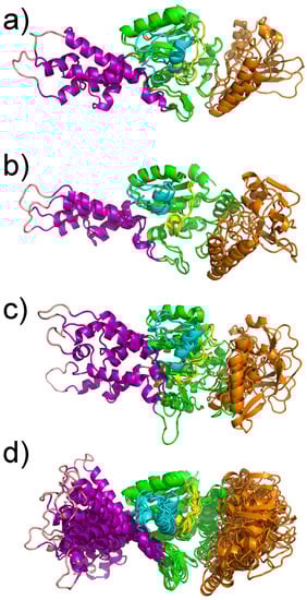 - Aleksiev, T.; Potestio, R.; Pontiggia, F.; Cozzini, S.; Micheletti, C. PiSQRD and a web server for decomposing proteins into quasi-rigid dynamical domains. Bioinformatics 2009, 25, 2743–2744. [Google Scholar] [CrossRef] [PubMed]