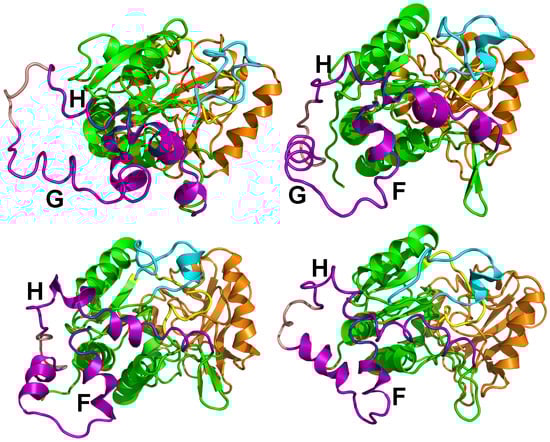 Representative conformations of the 10 clusters, labeled from a to j, and detected along sr-TAMD and MD trajectories. The conformation labels corresponding to the labels written on the SOM figure. Each conformation is drawn in cartons, with the region CA in green, the region CB in orange and the region SA in magenta. The catalytic loop is colored in yellow, and the C terminal loop in cyan. The -hairpin region (residues 259–273) is colored in blue. This figure was reproduced from [38].